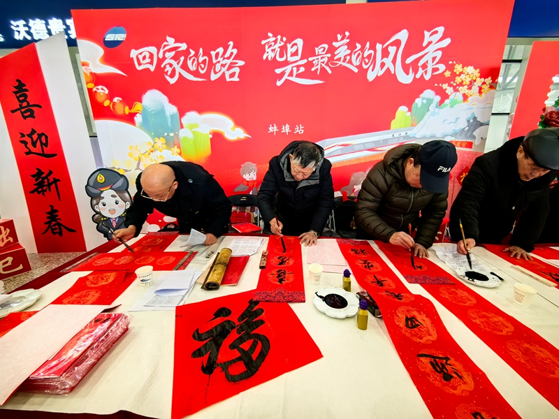 蚌埠站开展“送万福进万家”活动,邀请铁路书法家和书法爱好者挥毫泼墨,赠送旅客春联福字。孟婧雅摄 新华网发