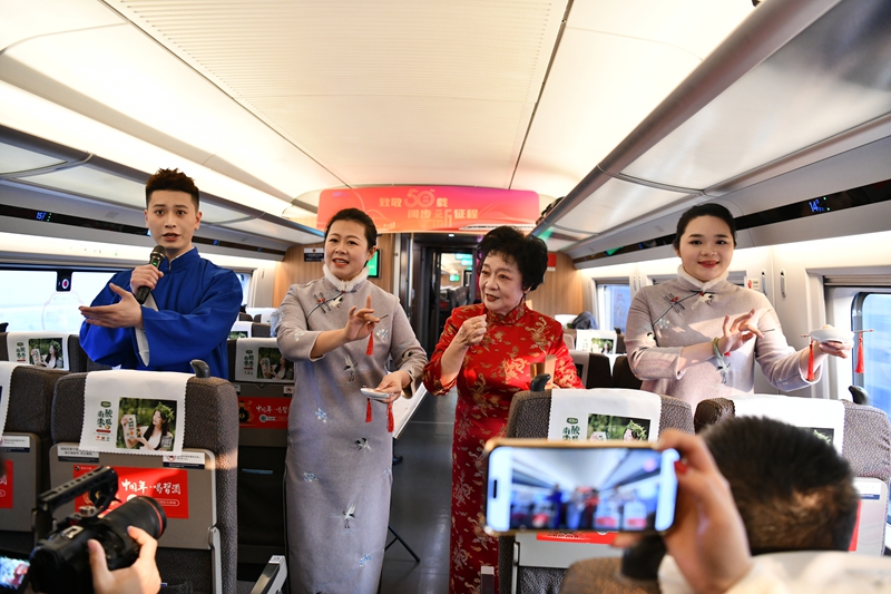 剪纸、面塑、吹糖人、云雾茶……多位非遗传承人亮相连云港站。江南丝竹民乐在苏州站轮番上演,优美的昆曲《牡丹亭》在候车大厅之中久久回荡。“我的家乡在南京,六朝古都是金陵……”在飞驰的G1605次列车上,国家级非物质文化遗产南京白局市级代表性传承人许茹等人的精彩演出,博得阵阵喝彩。