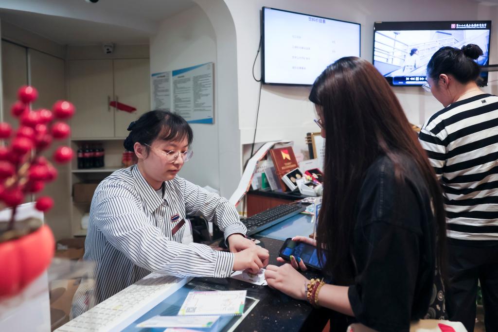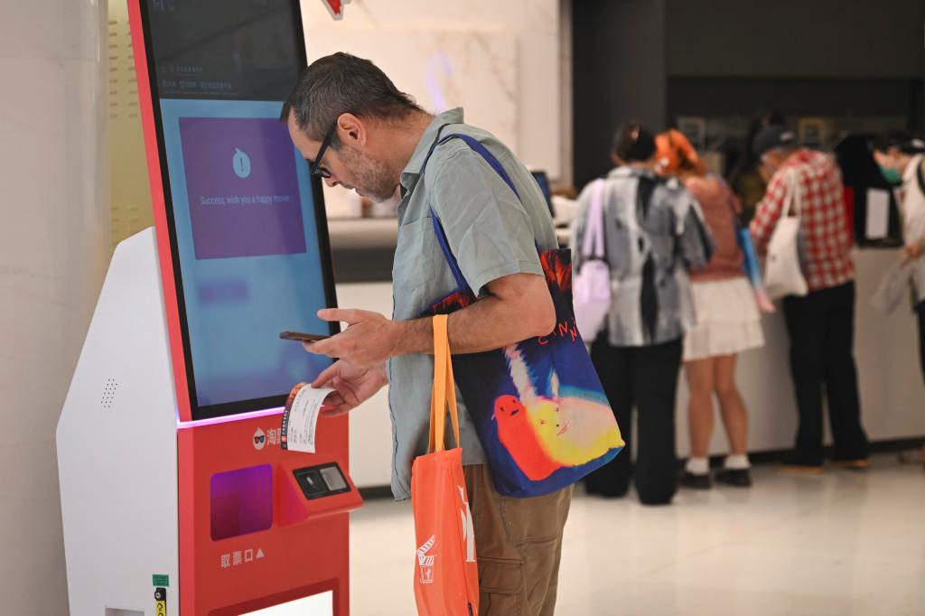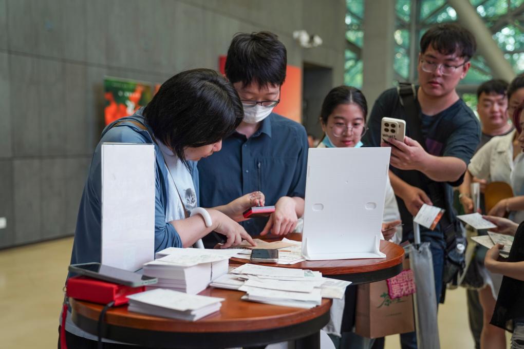 6月15日,在上海天山电影院(虹桥艺术中心旗舰店),影迷在参加凭票根盖章活动。