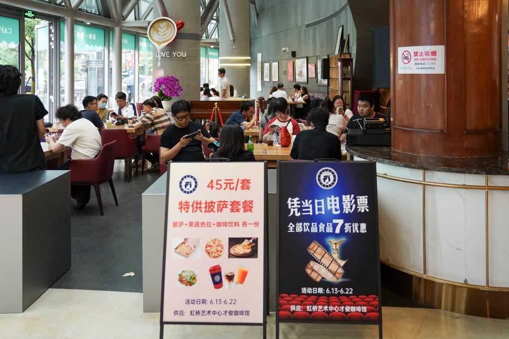 6月15日,在上海天山电影院(虹桥艺术中心旗舰店),位于一楼的咖啡馆推出“凭票根享优惠”活动。