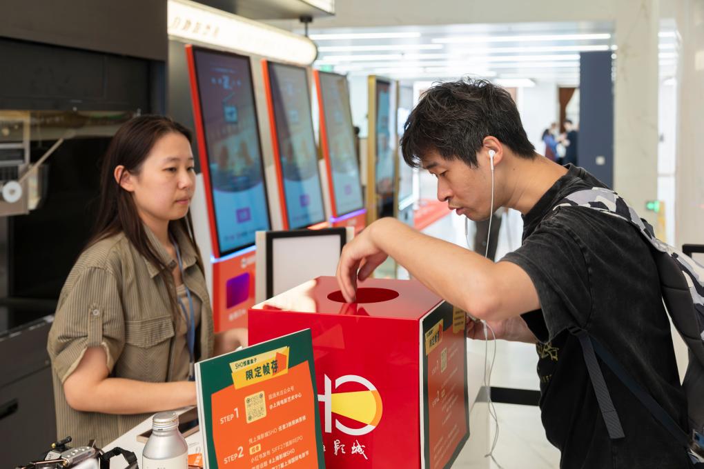 6月20日,观众在上海影城凭展映票根参加抽奖活动。