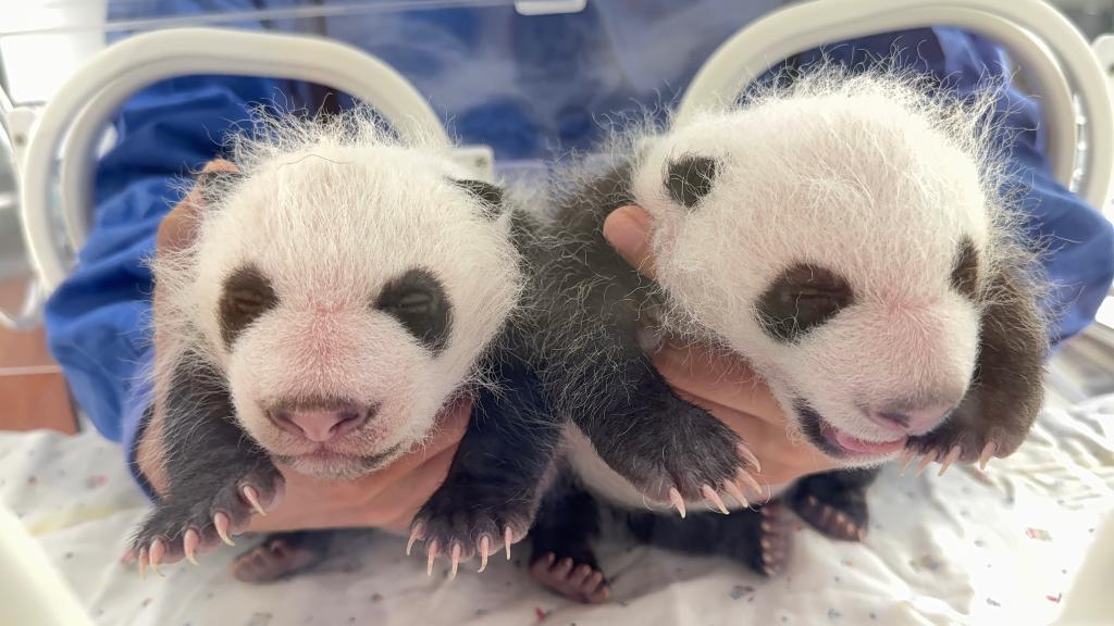 尽管如此,它们的成长速度令人惊叹,短短一个月,两只崽崽的体重均达到了1300克左右。它们的毛发已黑白分明,覆盖了原本粉嫩的皮肤,眼睛、耳朵、肩膀及四肢的黑色绒毛尤为醒目,与妈妈“芊金”如出一辙的“黑眼圈”和“黑马甲”,让它们初具“熊样”。