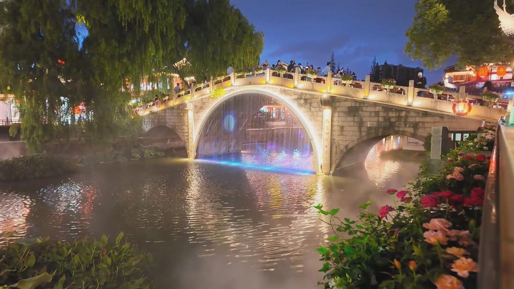 北大街上空挂满了各色锦鲤灯笼,它们在微风中轻轻摇曳,仿佛在诉说着美好的祝福,唐桥桥洞处的水幕光影秀与潺潺流水相互映衬,营造出一种如诗如画的意境。