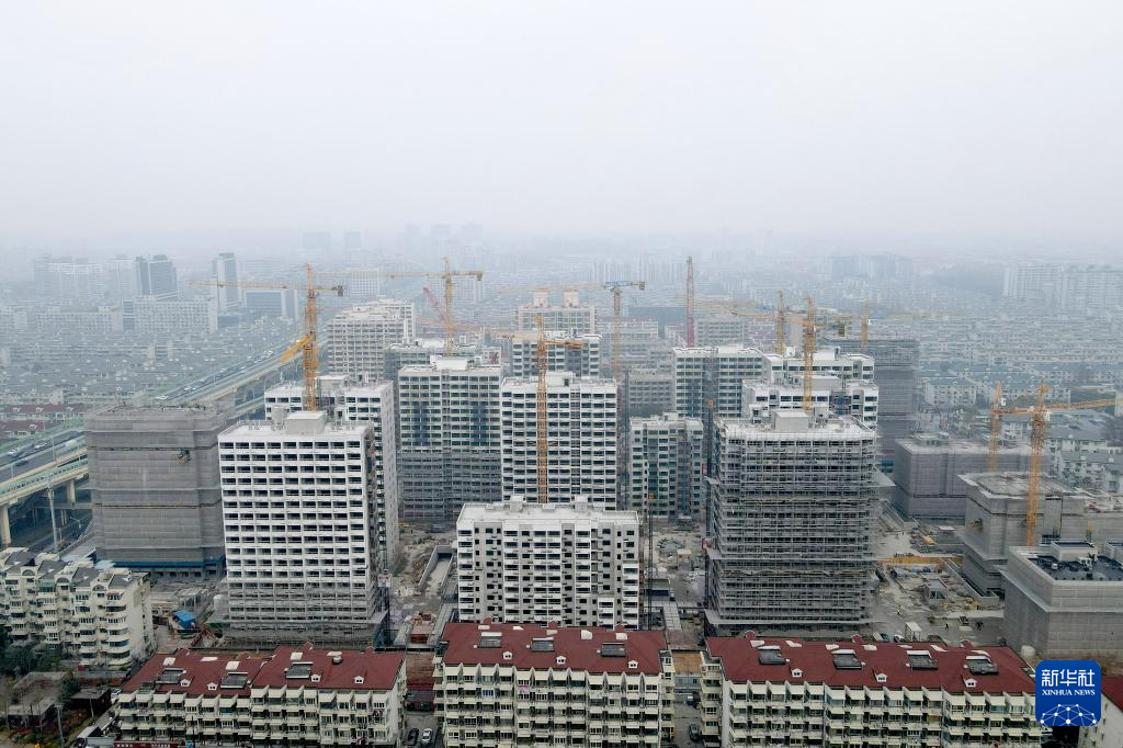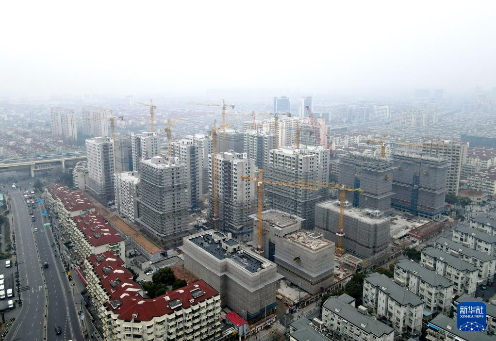 空中俯瞰上海市静安区彭一小区非成套旧住房改造工程建设工地(无人机照片,2024年1月10日摄)。
