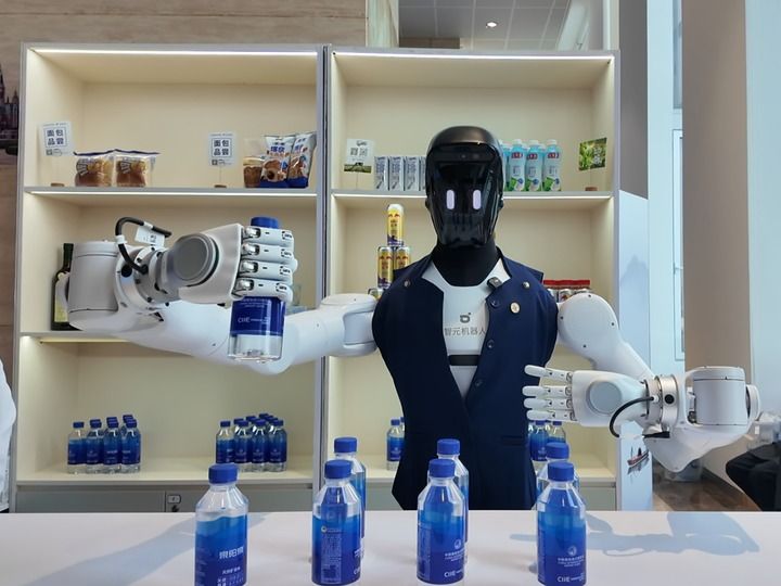 11月6日,位于进博会新闻中心二楼的人形机器人“小闻”。新华社记者 周心怡 摄