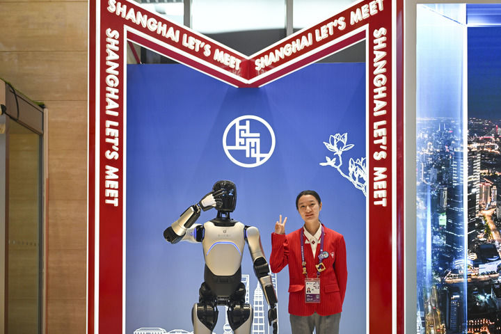 11月4日,志愿者(右)在第八届进博会新闻中心与“机器人志愿者”合影。新华社记者 陈浩明 摄