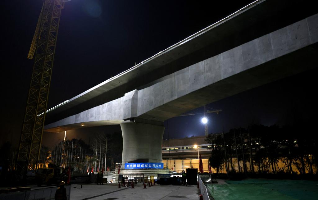 1月8日晚,沪苏通铁路二期(太仓至四团段)控制性工程——川沙特大桥跨磁悬浮连续梁,在4台智能连续转体千斤顶同步牵引下,上跨既有磁悬浮线路及迎宾高速公路,成功实现转体,转体角度60度,转体总重量约1万吨。该工程是国内首例在高速磁悬浮运营线路上方实施的大跨度连续梁转体施工,标志着沪苏通铁路二期建设取得关键进展。