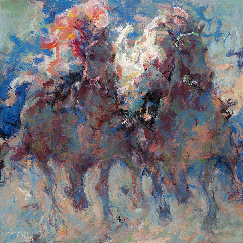 贝家骧接受记者采访时表示:“旅居海外多年,我一直在尝试将西方的色彩构成与中国传统讲究的‘气韵’相融合。”谈及本次展览的核心题材,他说:“我最偏爱的是‘马’系列。并不追求解剖学上的写实,而是想捕捉那种‘山雨欲来’、蓄势待发的瞬间。”