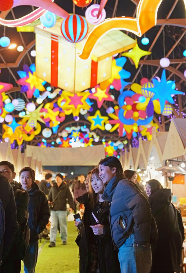 2月1日晚,游客在外滩枫径年味集市休闲游览。