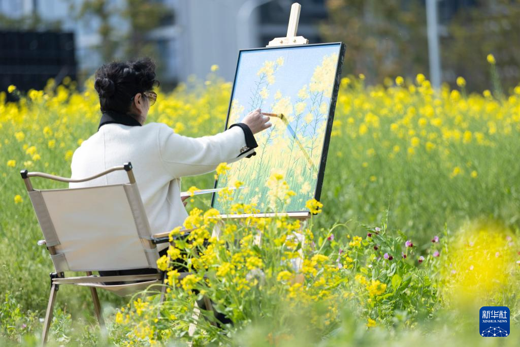 3月29日,市民在油菜花海内绘画。